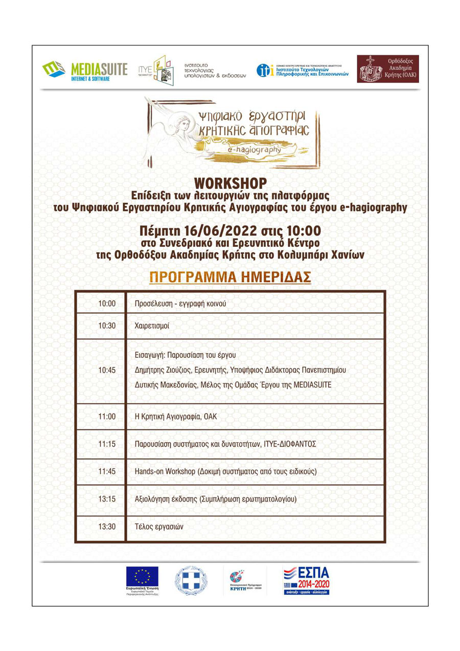 - υλοποίηση του πρώτου δια ζώσης WorkShop – Επίδειξη των λειτουργιών της πλατφόρμας του Ψηφιακού Εργαστηρίου Κρητικής Αγιογραφίας του έργου e-hagiography